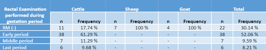 It was determined that 61.29% of cattle that had offspring with congenital anomalies received rectal examination for the diagnosis of pregnancy in the early period ofgestation . The relationship between the period of rectal examinations performed during pregnancy and the birth of offspring with congenital anomalies is presented in table 9.