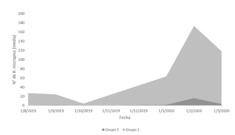 Media de Rhipicephalus (Boophilus) microplus (hembras de 4,5 a 8 mm de largo) sobre los bovinos de agosto de 2019 a marzo de 2020 en el ensayo de control integrado en INTA EEA Colonia Benítez. Grupo 1: Tratados: Grupo 2: Control.