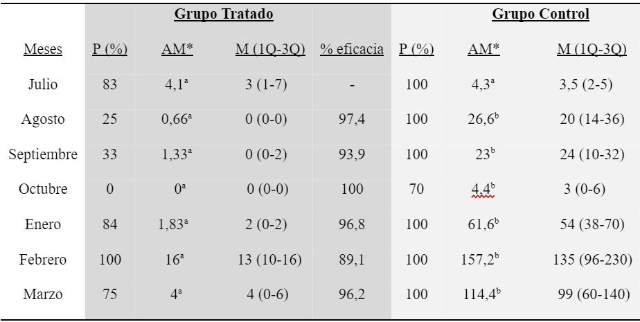 Prevalencia (P), abundancia media (AM), y mediana (M) con el primer y tercer cuartil (1Q-3Q) de Rhipicephalus(Boophilus) microplus (hembras de 4,5 a 8 mm) del grupo tratado y grupo control de vacas y vaquillas preñadas.El porcentaje de eficacia terapéutica (% eficacia) alcanzado en el grupo tratado también es indicado. El ensayo de control integrado fue realizado en Colonia Benítez, Chaco, Argentina, entre julio de 2019 y marzo de 2020.