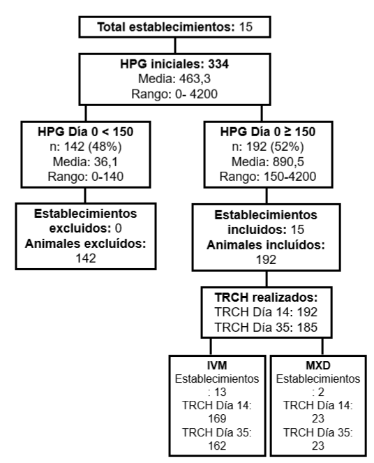 Establecimientos y animales experimentales: En el período 2019 a 2021, la eficacia de la ivermectina y moxidectina sobre los pequeños estróngilos fue estudiada en 15 establecimientos de las provincias de Santa Fe (3), Córdoba (10), La Pampa (1) y Tucumán (1). Como animales experimentales se utilizaron inicialmente 334 equinos de 5 meses de edad hasta más de 20 años, de ambos sexos (incluyendo castrados y padrillos) y de diferentes biotipos y funciones por ejemplo trabajo, deporte, yeguas destinadas a transferencia de embriones o exposiciones ecuestres. El criterio siguiente para ser incluidos en el estudio fue contar en el día -1 o 0 de la experiencia con valores del número de huevos por gramo de heces (HPG) igual o superior a 150 y no haber recibido tratamiento antihelmíntico al menos en los últimos 60 días.