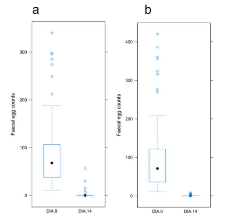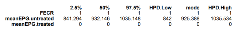 Análisis estadísticos: Los valores del número de huevos se sometieron a un análisis estadístico utilizando un paquete "eggCounts" en R específicamente diseñado (utilizando modelos jerárquicos bayesianos para datos de recuento de huevos fecales) que utiliza una estimación de la reducción media y 95 % de IC y una interfaz web (http://shiny.math.uzh.ch/user/furrer/shinyas/shiny-eggCounts/), que permite eliminar los errores de Poisson en la técnica de conteo (Nielsen et al., 2022b; Torgerson et al., 2014). El % del TRCH fue calculado para cada animal y las medias de los TRCHs, los IC al 95 % y las medias y rangos de los conteos de huevos pre y post tratamiento fueron también calculados para cada establecimiento. La eficacia general de la droga sin considerar los establecimientos individuales fue graficada utilizando el mismo modelo jerárquico bayesiano como la posterior distribución de las reducciones en el TRCH.