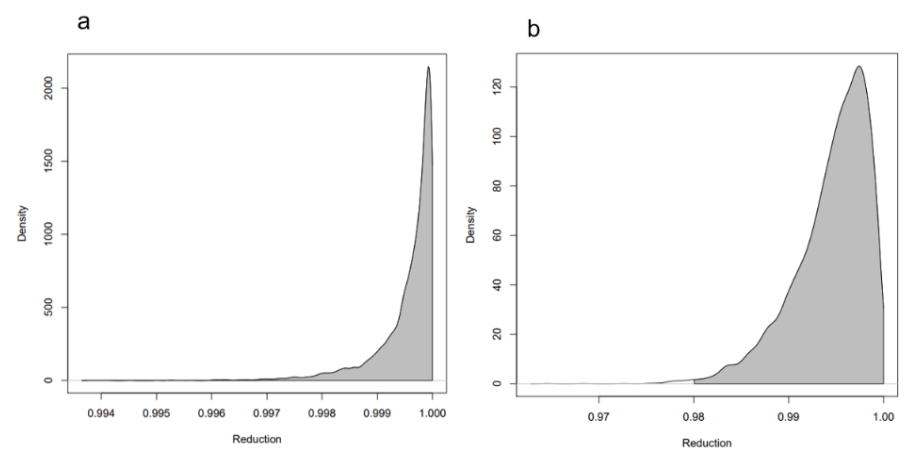 Asimismo, el TRCH realizado sobre el día 35 para determinar si el PRH a ese día se encontraba acortado con ambas lactonas, tuvo un rango de eficacia del 94,2 al 100 % para la ivermectina (n 13) y del 100 % para la moxidectina (n 2). Del total de 192 equinos evaluados al día 14 post tratamiento, en 22 animales no se pudo realizar el TRCH en el día 35. En la Figura 3 (no incluye Moxidectina, n=2), se presentan los valores de la eficacia general de la ivermectina visualizada como la distribución posterior de la reducción del HPG al día 35 en los equinos tratados con ambas formulaciones empleando “eggCounts” package in R (http://www.math.uzh.ch/as/). En sólo uno de los establecimientos tratados con ivermectina (pastas equinas) se encontró un PRH acortado. En este establecimiento (12 Tucumán) y en la categoría de potrillos, el TRCH no se pudo realizar sobre el día 35 específicamente sino en el día 39 postratamiento y el % de reducción para este día fue de 78,1 con un IC al 95 % de 66,8 y 85,5. La eficacia de la droga en los potrillos de este establecimiento en particular, fue a los 14 días post tratamiento del 100 % pero en el día 39 del mismo (Figura 4), el total de los 14 animales que componían este grupo ya eliminaba huevos en la materia fecal (media aritmética: 251,4 y rango: 80-600).