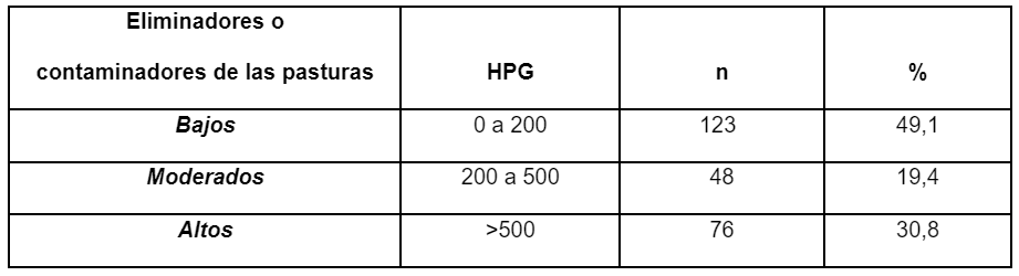 En el presente estudio la eliminación de huevos antes del tratamiento en los equinos adultos (n 247) fue sobredispersa o agregada y en línea con lo observado típicamente con este tipo de datos parasitológicos (Cooper et al., 2020). El rango en los valores del HPG fue de 0- 2120 y, de acuerdo a la eliminación de huevos antes del tratamiento, aproximadamente el 31% de los animales fueron considerados como altos eliminadores, el 19% como moderados y el 50% como bajos, considerando los puntos de corte tal como se lo expresa en la Tabla 2. En los coprocultivos realizados al pre-tratamiento más del 97% del total de las larvas obtenidas fueron clasificadas como pequeños estróngilos.