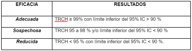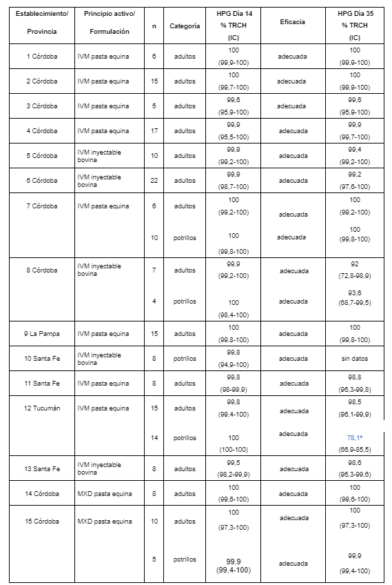 Determinaciones de eficacia y Período de Reaparición de Huevos: para determinar la eficacia clínica de la ivermectina se realizó el cálculo de la reducción en el conteo de huevos a las dos semanas posteriores al tratamiento, siguiendo las recientes recomendaciones de la World Association for the Advancement of Veterinary Parasitology (WAAVP) (Nielsen et al., 2022b) para la evaluación de antihelmínticos equinos en estudios de campo. La eficacia de la droga (adecuada, sospechosa o resistente) a nivel de establecimientos fue determinada usando la media del TRCH (%) y el límite inferior del intervalo de confianza (IC) de acuerdo a la Tabla 1.