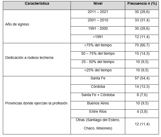 En total se aplicaron 105 encuestas a Médicos Veterinarios que realizan sus actividades profesionales en rodeos lecheros bovinos. Los encuestados desarrollaban sus actividades profesionales en lechería bovina desde hacía 15,9 años en promedio, con rangos entre 1 y 40 años. Las características de los Médicos Veterinarios encuestados se detallan en la Tabla 2. Se aprecia un importante rango en cuanto al año de egreso de los encuestados, lo que concuerda con los años de antigüedad laboral. La mayor parte de los Médicos Veterinarios dedicaban la mayor parte de su tiempo al trabajo en establecimientos lecheros ubicados, primordialmente, en las provincias de Santa Fe y Córdoba (75,3%).