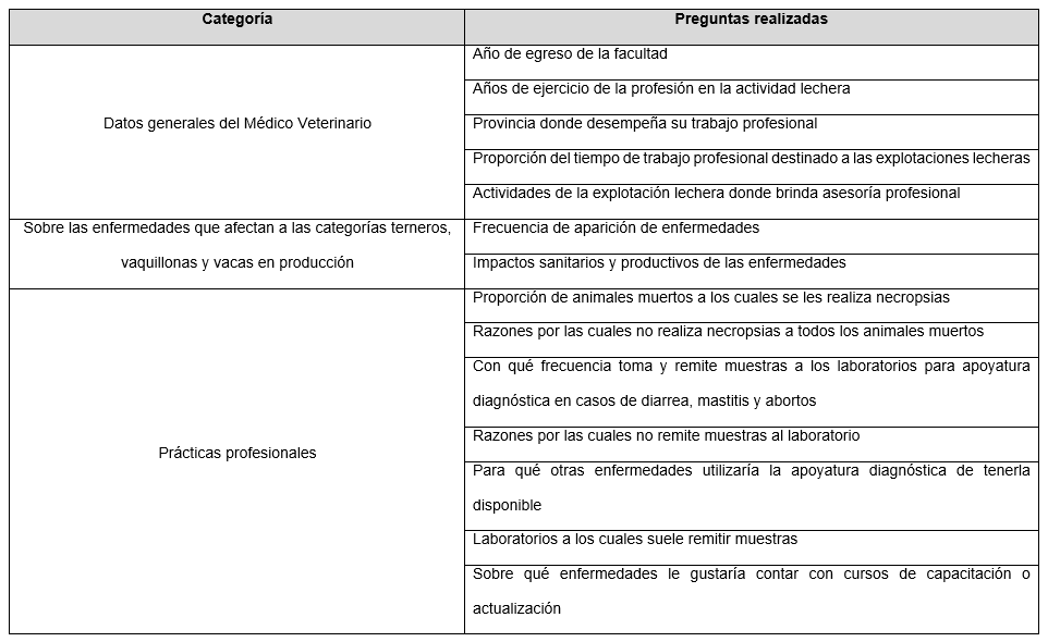 La encuesta se dividió en diferentes secciones, la generalidad de las preguntas se presenta en la Tabla 1 y la encuesta completa puede ser entregada bajo solicitud a los autores de este trabajo o localizada en el sitio: https://forms.gle/o5WmuRHrkAeRcWL69. Inicialmente se consultó sobre la antigüedad en el desempeño de sus actividades profesionales y el tiempo dedicado a las explotaciones lecheras, así como los aspectos profesionales sobre los cuales trabaja mayoritariamente. Posteriormente, se dividieron los problemas sanitarios en tres grandes categorías animales (terneros, vaquillonas y vacas en producción) y se identificaron los principales problemas sanitarios a juicio del grupo de autores de este trabajo. Los encuestados debían categorizar cada problema de acuerdo a la frecuencia de presentación y su severidad en caso de presentarse en un rodeo lechero. La frecuencia de presentación fue establecida en función del número de casos o brotes de la enfermedad que ocurren durante un año. Por severidad se aclaró que debían referir tanto a la letalidad como al impacto que la enfermedad genera sobre la producción animal (Ej.: reducción en la producción de leche, marcada baja en el ritmo de crecimiento, reducción de la fertilidad). Además del listado ofrecido, los encuestados podían identificar otros problemas sanitarios que, a su juicio, fuesen de relevancia para ese sector productivo. Finalmente, fueron consultados sobre la realización de algunas prácticas diagnósticas (necropsias, toma y remisión de muestras para análisis en laboratorios específicos) y, en caso de no realizarlas, las razones por las cuales no las adopta, así como las necesidades que perciben sobre apoyatura diagnóstica y capacitación profesional.
