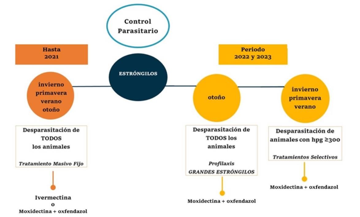 Previo al año 2022, el establecimiento seguía un esquema de desparasitación fija y masiva cada tres meses alternando sistemáticamente una combinación de ivermectina y praziquantel con otra de moxidectina, oxfendazol y praziquantel. Durante el periodo de este estudio (2022- 2023) el establecimiento utilizó la misma frecuencia de tratamiento, pero utilizando solo la última combinación citada (Trimox plus® – Laboratorio Over) y solo en los animales que mostraron determinados valores del hpg. El punto de corte (PC) o valor sugerido para decidir si el animal iba o no a recibir tratamiento fue de hpg ≥ a 300, aunque hubo algunas escasas excepciones donde se trató animales con un número menor debido a que la decisión final fue tomada por los propietarios del establecimiento según criterios particulares. Durante toda la experiencia, los pesos fueron estimados por el personal a cargo de los animales. Independientemente a este esquema de tratamientos selectivos basados en los valores del hpg, todos los animales del establecimiento recibieron anualmente (marzo 2022 y marzo 2023) un tratamiento profiláctico masivo con Trimox plus® para controlar nematodes del género Strongylus (grandes estróngilos) y cestodes. La Figura 1 sintetiza el uso y antecedentes de los tratamientos antihelmínticos.