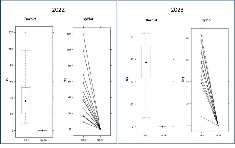El uso de tratamientos selectivos requiere que la actividad de la droga a emplear en los mismos presente una eficacia alta. En los dos años de nuestro estudio la eficacia de la combinación antihelmíntica utilizada se determinó a los 14 días postratamiento siguiendo las nuevas recomendaciones de la WAAVP (Geurden et al., 2022) y resultó en una reducción del 100% (Figura 2), Esta eficacia es similar a la informada en general para nuestro país con el uso de las lactonas (ivermectina y moxidectina) registradas para el control de los pequeños estróngilos equinos (Anziani & Ardusso, 2017; Cooper et al., 2022). La ivermectina, por ejemplo, se ha mantenido activa por más de 40 años, pero recientemente el primer hallazgo de resistencia a esta droga ha sido informado en un establecimiento de la Argentina (Cooper et al., 2024). Si bien se sospecha que esta población resistente pudo ser ingresada con equinos importados por este establecimiento, es probable que, dado el extensivo uso de las lactonas y la alta movilidad de los hospedadores equinos, también se puedan estar desarrollando en la Argentina otros aislamientos con RA a estas drogas. Esta situación enfatiza la necesidad de monitorear la actividad de las drogas en el campo antes de implementar estos programas de TS. Las combinaciones antihelmínticas como las empleadas en nuestro trabajo se caracterizan por sus efectos aditivos y no sinérgicos (Scare et al., 2020) y en este contexto se considera que la actividad observada es fundamentalmente el resultado de la actividad de la moxidectina, ya que la RA a los benzimidazoles es extremadamente común en la región en la que se desarrolló este estudio (Cerutti et al., 2012; Anziani et al., 2016)
