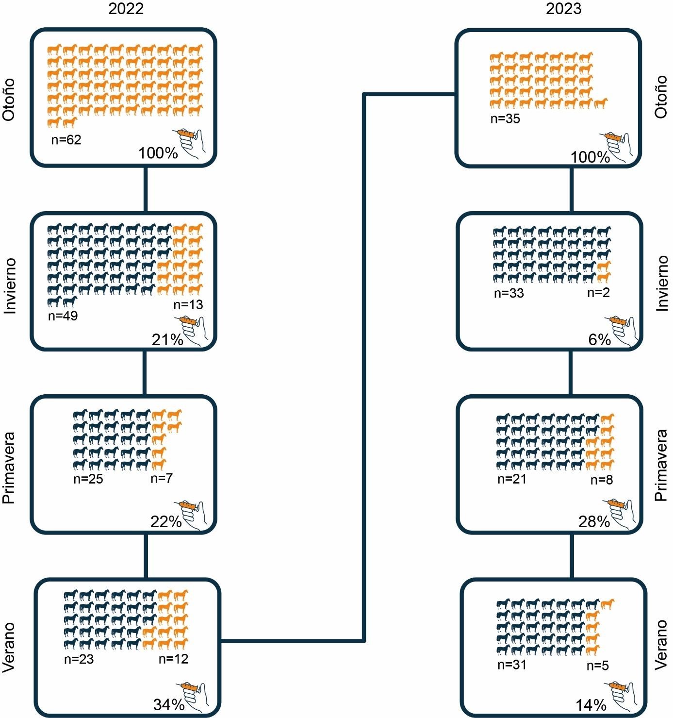 En la Figura 3 se observa la distribución de los animales muestreados por estación indicando en color azul aquellos animales que permanecieron como refugio. Se muestra también los porcentajes de animales que recibieron tratamiento a lo largo del programa de TS. En promedio la cantidad de equinos que no recibieron tratamiento durante los dos años fue de casi el 80% en cada estación.