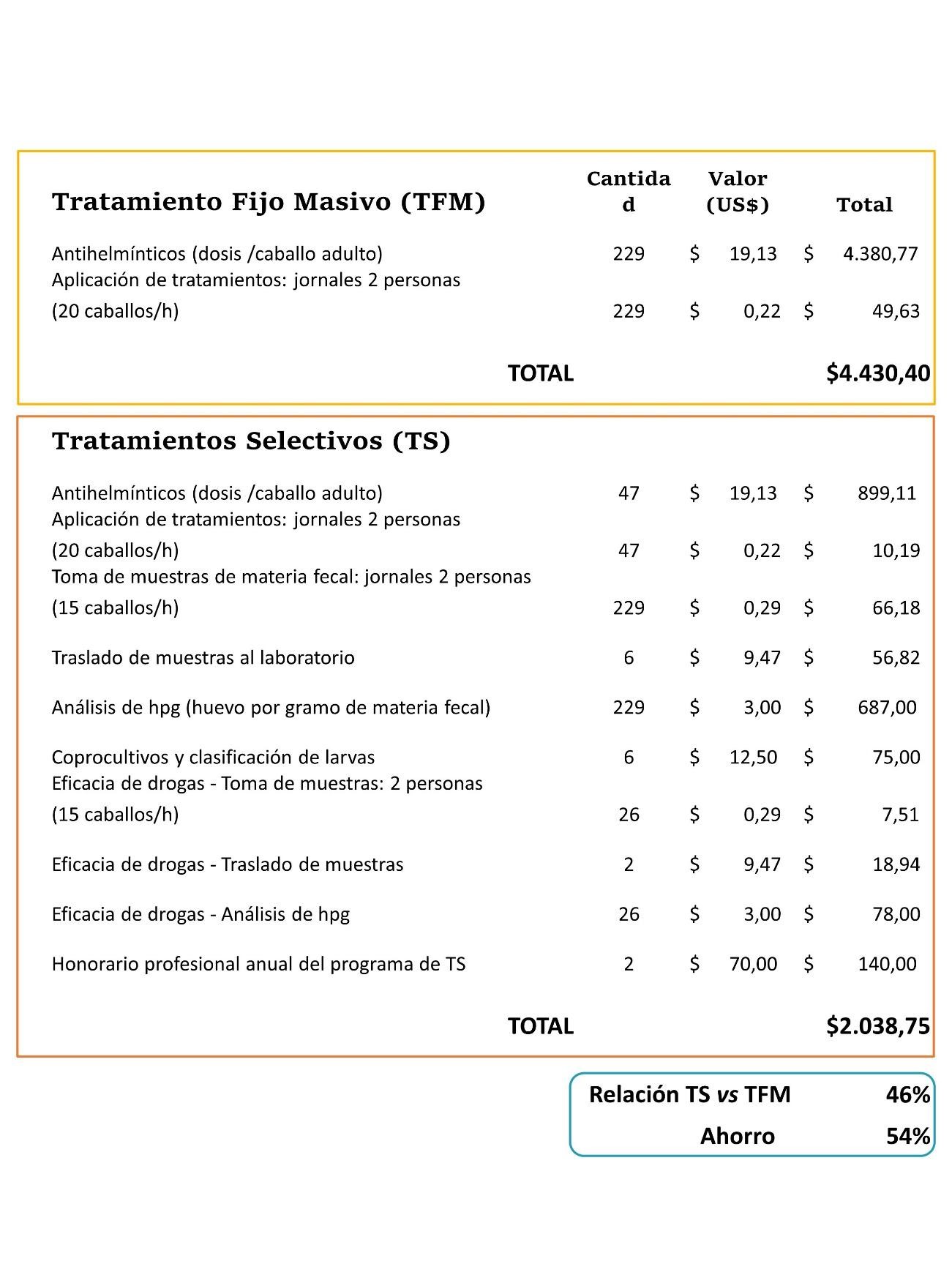 Una vez finalizado los dos años de TS se realizó un análisis económico para comparar los costos implícitos en la implementación de TS en comparación con el sistema fijo de desparasitación masiva –Tratamiento Fijo Masivo (TFM) - utilizado previamente. El costo total de los TS incluyó el de todos los análisis coproparasitológicos (hpg + coprocultivos), un estudio anual de eficacia de drogas, la mano de obra para la toma de muestras y para la aplicación de los tratamientos, el traslado de muestras y los antiparasitarios utilizados para cada tratamiento. Por otro lado, para calcular los costos del TFM se consideró el valor de los antiparasitarios que hubieran sido utilizados de haber seguido con este esquema (costo de antiparasitarios más costos de mano de obra de aplicación). Los costos analizados se expresaron en dólares estadounidenses tomando como referencia el valor del dólar $845 del Banco Nación de la República Argentina al 31/01/2024.