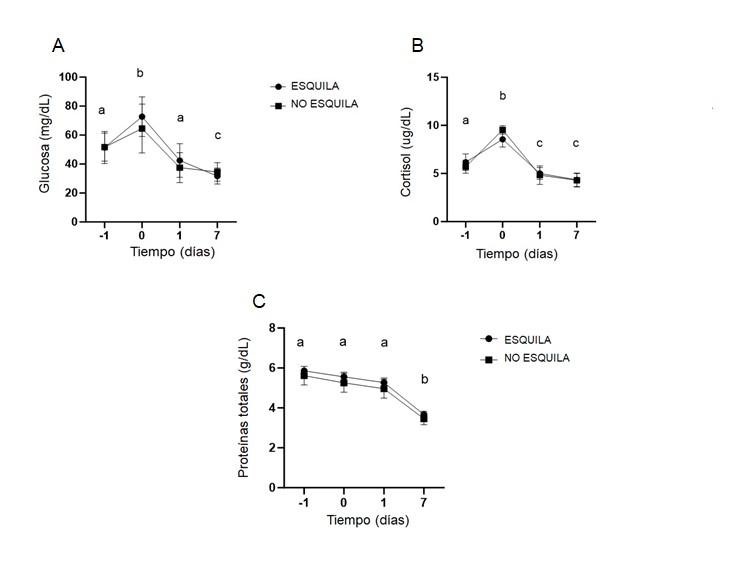 Tanto los niveles de glucosa como de cortisol mostraron un aumento significativo (ANOVA con medidas repetidas, p<0,005) en ambos grupos al momento de la esquila, que luego van disminuyendo con los días; los niveles de proteína fueron mayores en los primeros 3 puntos temporales del ensayo. (Figura 1). No se encontraron diferencias entre los grupos, pero observamos una variación en los niveles de proteínas, glucosa y cortisol de ambos grupos a lo largo del tiempo (respuesta al estrés). Hefnawy et al. (2018) obtuvieron resultados similares en una línea de tiempo que evaluó parámetros de estrés durante la esquila. Además, en los sistemas extensivos, la esquila es especialmente estresante, ya que los animales son frecuentemente manejados con perros o personas desconocidos, ubicados en corrales más pequeños cerca del galpón de esquila, donde están expuestos a altos niveles de ruido producido por la máquina esquiladora (Ungerfeld y Freitas- de-Melo, 2019; Hargreaves y Hutson, 1990). Hay informes de aumentos en las concentraciones de cortisol (Jephcott et al., 1987; Corner et al., 2006; Sanger et al., 2011) y en la temperatura corporal (Piccione et al., 2002; Sanger et al. 2011) después de la esquila, lo que indica que el procedimiento es muy estresante.