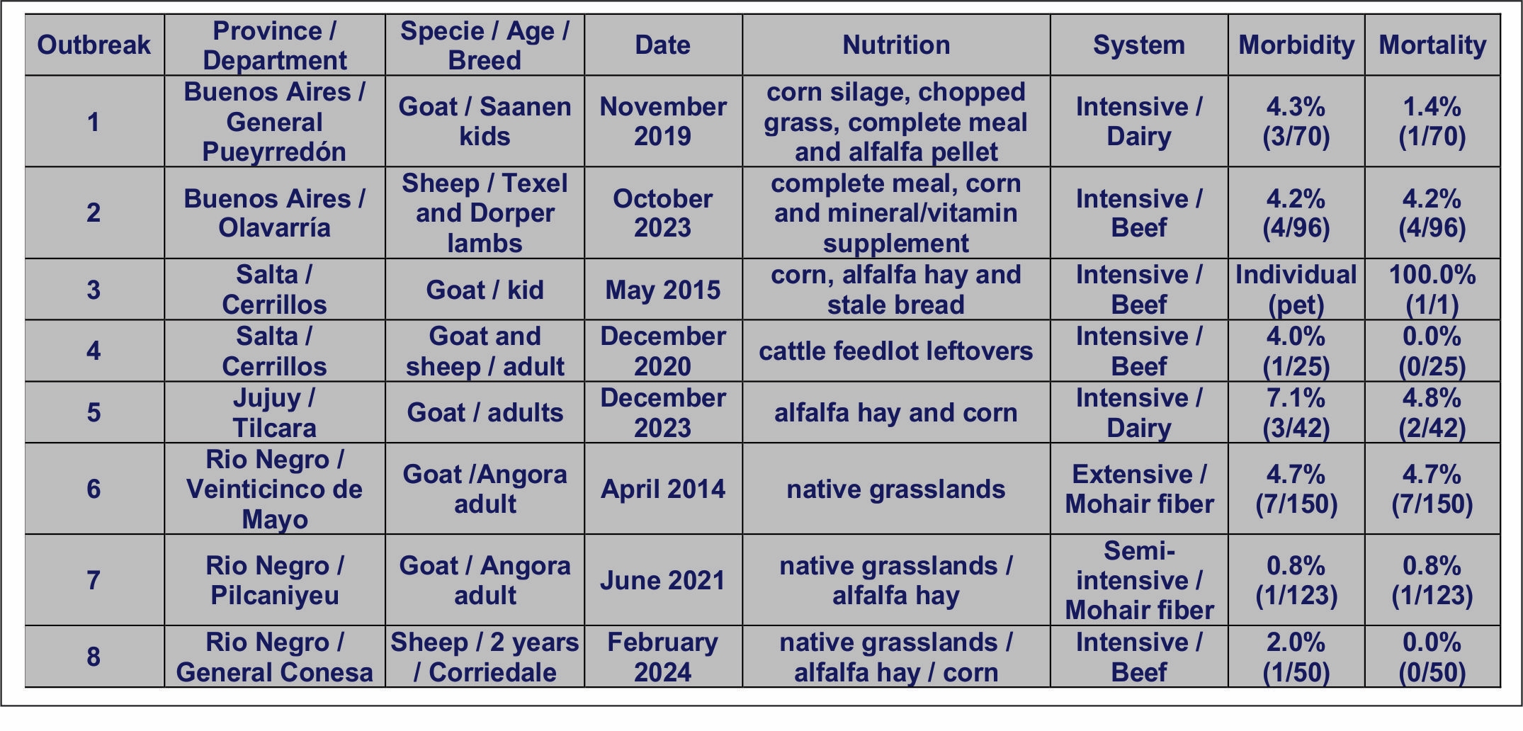 The database from three different Veterinary Diagnostic Services of INTA was revised: INTA Balcarce (2000-2023), INTA Bariloche (2010-2023) and INTA Salta (2013-2023). Eight outbreaks of PEM in small ruminants were included in this study. Diagnosis criteria was based on anamnesis, clinical signs, response to treatment, gross and/or histological findings.