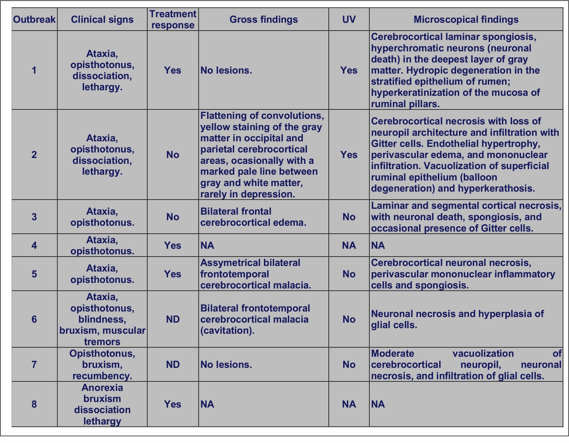 The descriptive term CCN usually refered grossly to softening of gray matter and histopathologically to laminar cerebrocortical necrosis. Among different diseases characterized by similar neurophatologic changes, it usually referred to different etiologies linked to thiamine (vitamin B1) deficiency (da Cunhal et al., 2010; Evans et al., 1975; Thornber et al., 1979). We support that four out of five PEM outbreaks included in this report (outbreaks #1, #4, #5 and #8) were related to thiamine deficiency because some affected animals responded favorably to treatment with dexamethasone and thiamine.