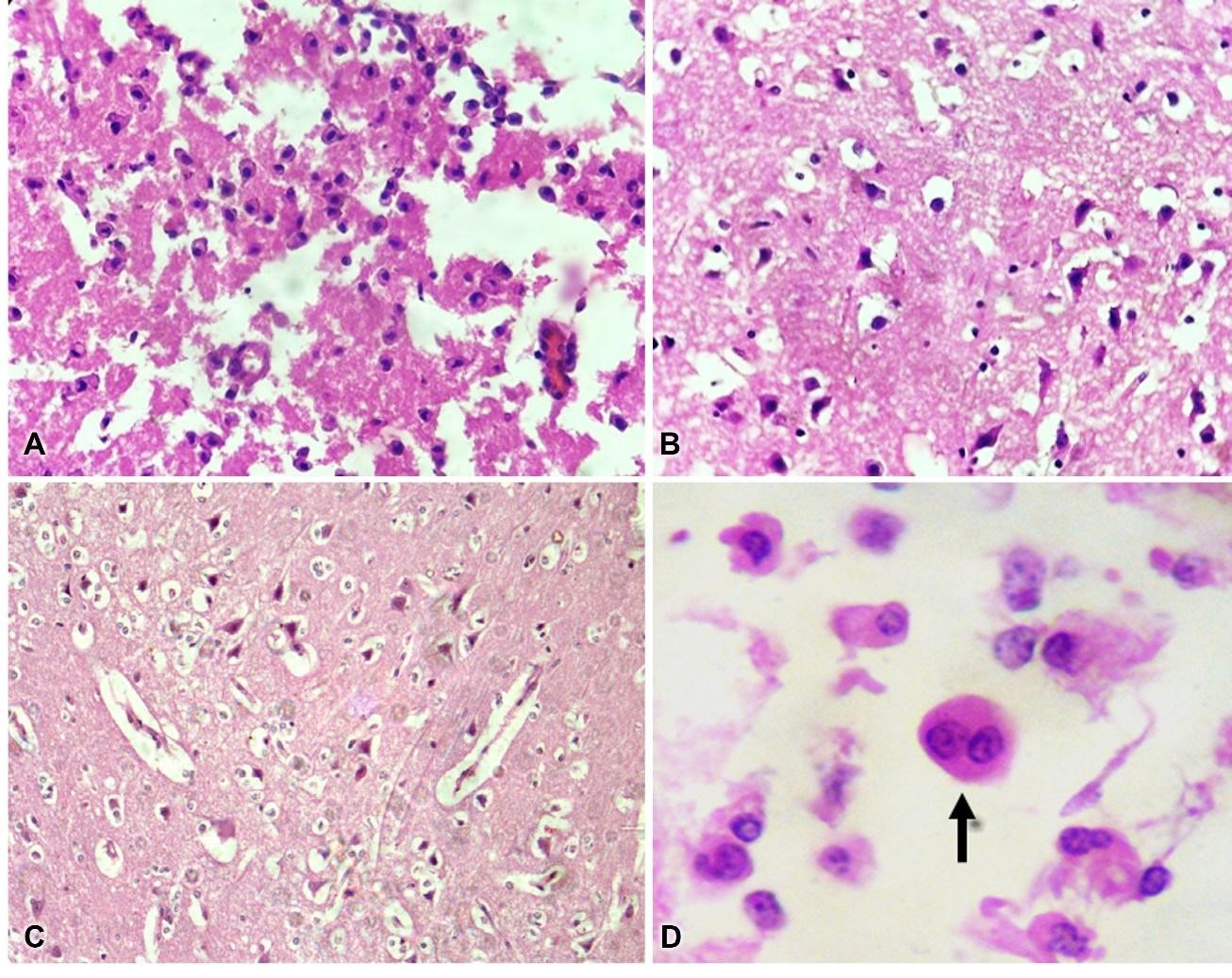Histopathological diagnosis is key to confirm CCN. Laminar neuronal degeneration with individual neuronal necrosis in the cerebral cortex, neuronophagia, endothelial cell hyperplasia, and gliosis are characteristic lesions associated with PEM (Câmara et al., 2018; Kiupel et al., 2003).