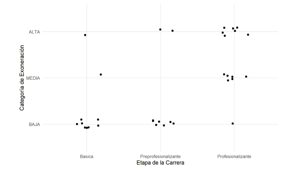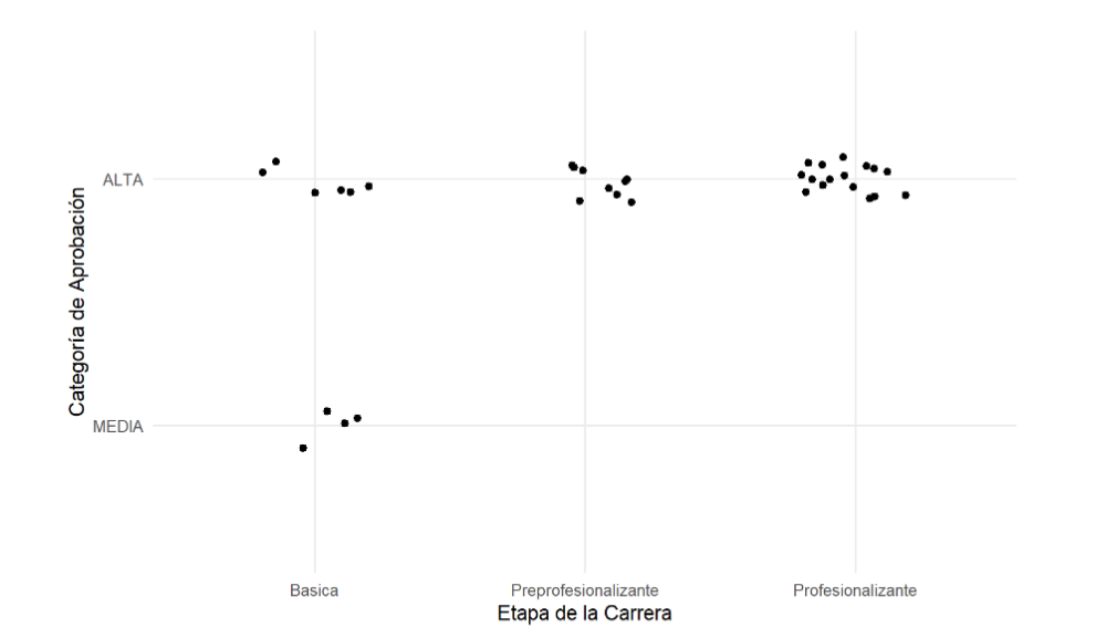Los resultados de la prueba Chi-cuadrado indican que tasas de aprobación (TA) y tasas de exoneración (TE) están relacionadas de manera significativa con la etapa de la carrera: Básica, Pre-profesional, Profesional (TA: X(2). = 54,959, p ≤ 1,164e-12, p ≤ 0,001; TE: X(4). = 39,413, p≤ 5,724e-08, p ≤ 0,001, figura 5 y 6). Además, la categoría de exoneración muestra una relación significativa con la categoría de aprobación: Alta, Media y Baja (X(2). = 16,975, p ≤ 0,0002, Figura 5 y 6).