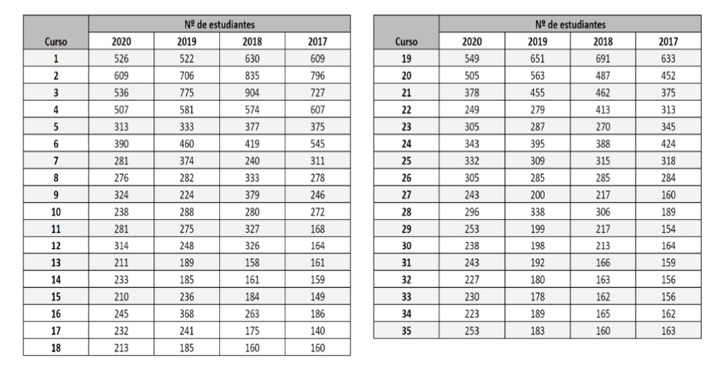 En este estudio, participaron los alumnos que habían cursado las 35 materias del Ciclo Común Obligatorio (CCO) de la carrera de Veterinaria de la Facultad de Veterinaria (figura 1) en la Udelar durante la enseñanza virtual en el año 2020, así como los alumnos que cursaron dichos cursos comunes durante los años previos (2017-2019). Se accedió a los datos académicos sobre el rendimiento de los alumnos a través del Sistema de Gestión de Bedelía de la Udelar. En la tabla 1 se reporta el número de alumnos de cada curso y de cada uno de los años académicos, desde 2017 a 2020.
