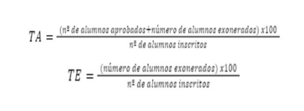 Con los datos sobre el rendimiento académico de los alumnos, se cuantificó el número de: (a) aprobados, definidos como aquellos alumnos que tuvieron un buen desempeño en la materia, aunque tienen que superar el examen final para aprobar la materia; (b) no aprobados, que son aquellos alumnos que han tenido un desempeño insuficiente en la materia y que deben volver a cursarla; (c) exonerados, que son los alumnos que tuvieron un desempeño destacado en la materia /curso, por lo que no tienen que presentarse al examen. A partir de estos datos, se calculó la Tasa de Aprobación (TA) y la Tasa de Exoneración (TE) para cada uno de los cursos mediante el empleo de las siguientes formulas: