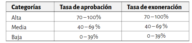Una vez calculadas las tasas de aprobación y exoneración de los alumnos en los 35 cursos a lo largo de los años académicos, se procedió a clasificar a los cursos en función de dichas tasas en categorías de alto, medio y bajo para cada uno de los años en estudio (Tabla 2).