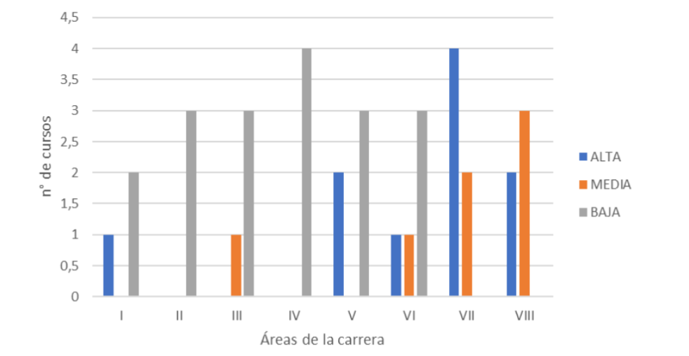 Los resultados indican que las tasas de aprobación (TA) durante el año 2020 fueron altas en todas las áreas del plan 98, excepto en el Área I, donde dos de los tres cursos presentaron tasas medias. En cuanto a la Tasa de Exoneración (figura 2), los cursos de las Áreas I a VI muestran mayoritariamente tasas bajas de exoneración, mientras que en las últimas áreas de la carrera (Áreas VII y VIII), los cursos presentan tasas medias y altas de exoneración.