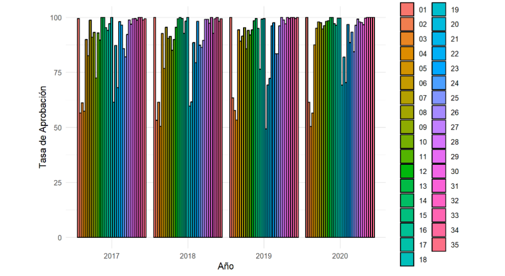 Respecto con la Tasa de Aprobación, no se encontraron diferencias significativas entre los cursos 2017 a 2020 (ANOVA, .3,136 = 0,237; p ≤ 0,871, Figura 3),