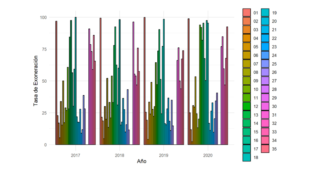 Comparando las tasas de exoneración entre los años 2017-2020, tampoco se encontraron diferencias significativas (ANOVA, .3,136 = 0,279; p ≤ 0,841, figura 4).