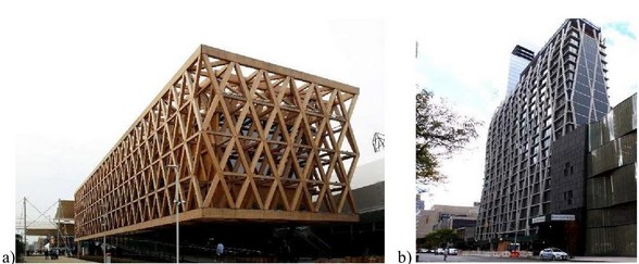 Actualmente se ha generado un interés renovado en utilizar armaduras perimetrales en edificios altos, lo que se ha reflejado en diversos proyectos de gran relevancia a nivel internacional. Vale la pena mencionar que la diferencia entre un tubo convencional contraventeado y una rejilla perimetral, es que la segunda carece de elementos orientados verticalmente, ya que las diagonales soportan simultáneamente las cargas verticales y laterales. Además, se han utilizado diferentes materiales estructurales para construir las rejillas rígidas. Ejemplos de rejillas que han sido edificadas con materiales diferentes al acero estructural se muestran en la Figura 1. En general, el bajo consumo de material estructural hace que las rejillas rígidas formen parte de proyectos sustentables de gran alcance, que han ganado reconocimientos importantes a nivel internacional. Por ejemplo, de acuerdo con el Consorcio Hearst, sus cuarteles generales ubicados en Nueva York, con una superficie total de 79,800 m2, fueron estructurados con una rejilla perimetral rígida, lo que resultó en un ahorro de aproximadamente 2,000 toneladas de acero estructural (alrededor de 21% menos que el requerido por un sistema de marcos convencionales). Además 30% del peso de la materia prima provino de fuentes de reciclaje.