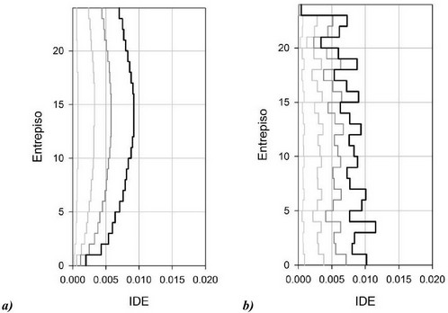 Para evaluar el desempeño sísmico de las 2 estructuraciones, se llevaron a cabo dos series de análisis dinámicos no lineales. Para ello, se utilizaron los 10 registros para establecer el espectro de diseño mostrado en la figura 9. La figura 11 resume los valores medios más una desviación estándar de deformación lateral en altura.