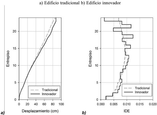 Mientras que la figura 11a considera los desplazamientos laterales y la 11b ilustra las distorsiones de entrepiso. Se observa que el sistema innovador desarrolla demandas que son ligeramente mayores que el valor de diseño de 0.01 (asociado durante el diseño al nivel de desempeño de Ocupación Inmediata). A pesar de esto, el mapeo de articulaciones plásticas indicó que el sub-sistema destinado a soportar cargas gravitacionales no desarrolla comportamiento plástico durante los diferentes movimientos del terreno considerados en los análisis, lo que implica que satisface, para todos ellos, el nivel de desempeño de Ocupación Inmediata.