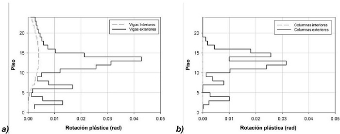La figura 12 presenta los valores medios más una desviación estándar de rotaciones plásticas máximas para el edificio tradicional (Montiel y Terán 2013). Es posible apreciar demandas severas de rotación plástica para el caso de las vigas exteriores (figura 12a). El valor de estas rotaciones es tan grande que impide satisfacer el nivel de desempeño de Seguridad de Vida. En el caso de las columnas perimetrales, se observan rotaciones ligeramente mayores que 0.03, lo que implica un nivel de daño extremo.
