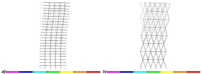 Se compararon el comportamiento sísmico y el costo ambiental (en términos de emisiones de dióxido de carbono) de dos sistemas estructurales. Mientras que uno consiste en un sistema tradicional con base en marcos momento-resistentes compuestos de concreto reforzado y acero estructural; el otro representa un ejemplo teórico de un sistema dual conformado por una rejilla rígida y un sistema de marcos flexibles de acero estructural.
