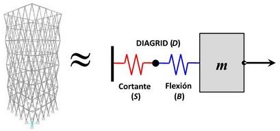 La idealización mostrada en la Figura 3 para una rejilla perimetral considera las siguientes hipótesis: A) Los sistemas de piso funcionan como diafragmas rígidos; B) La rejilla perimetral proporciona la rigidez lateral requerida por el edificio y C) Las componentes globales de deformación en corte y flexión de la rejilla pueden estimarse de manera independiente. Conforme a lo mostrado, es posible idealizar la rejilla perimetral como un sistema equivalente de un grado de libertad que cuenta con dos resortes que trabajan en serie; un primero que representa la rigidez global en corte, y el segundo, que hace lo propio para la rigidez global en flexión.