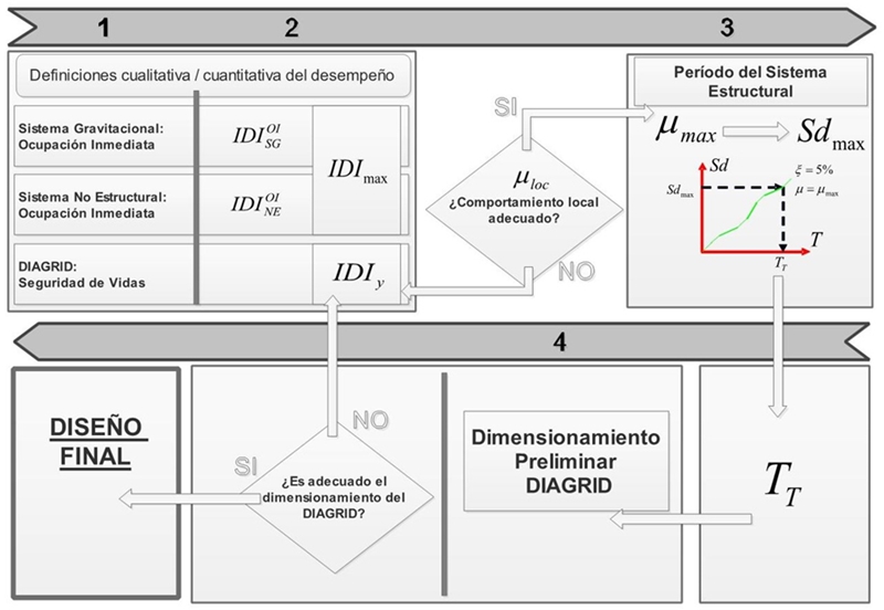 La Figura 4 resume la metodología usada para el dimensionado de las diagonales de la rejilla perimetral, la cual considera la idealización mostrada en la Figura 3 y un nivel de intensidad sísmica. En resumen, el primer paso consiste en establecer una definición cualitativa del desempeño esperado. Esto se hace a partir de la consideración explícita de los niveles de daño aceptables en los diferentes sub-sistemas que componen la estructura (rejilla perimetral, sistema gravitacional, elementos no estructurales). El segundo paso corresponde a la caracterización numérica del desempeño esperado por medio de establecer umbrales de respuesta. En el tercer paso se establece un valor objetivo para el período fundamental de vibrar del sistema estructural mediante el uso de un espectro de diseño de desplazamientos. En el paso final, se estima el área de las diagonales de la rejilla perimetral en función del periodo objetivo. Una discusión en profundidad de la metodología y un ejemplo detallado de su uso se publicarán próximamente. En lo que sigue, se esbozará la metodología para hacer posible un entendimiento razonable de su uso.