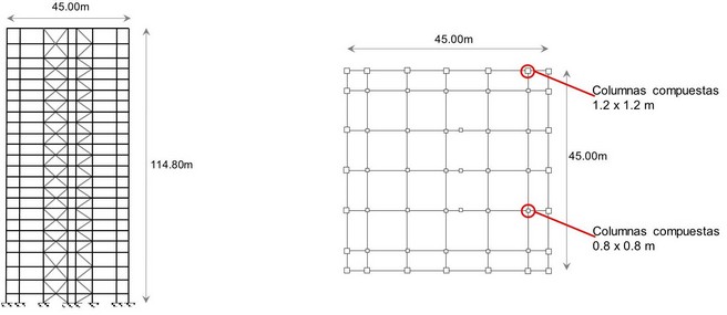 El sistema estructural tradicional se describe en mayor detalle en Montiel y Terán-Gilmore (2013). Cuenta con 24 niveles y se usa para alojar oficinas. Fue diseñado con el Reglamento de Construcciones para el Distrito Federal vigente en el año de 1993 (RCDF 1993), y se ubica en la Zona del Lago. La Figura 5 muestra que el sistema tiene una planta de 45 por 45 metros, y cuenta con alturas variables de entrepiso de 4.0, 5.65, 6.0 y 6.5 metros a lo largo de la altura total de la estructura. La altura total del sistema es de 114.8 metros. Su período fundamental de vibrar se estima en 2.67s.