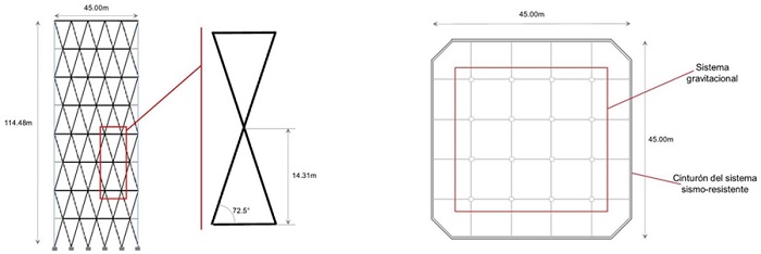 En este artículo, el sistema innovador considera un sistema estructural dual que integra el trabajo de dos sub-sistemas; uno que resiste la gran mayoría de las cargas gravitacionales, y un segundo que aporta sismorresistencia. Mientras que el primero está constituido por marcos de acero resistentes a momento con detallado estándar, el segundo queda conformado por rejillas perimetrales cuyas diagonales exhiben un ángulo de inclinación cercano a los 70º. Aunque no se hará referencia a ello de aquí en adelante, porque el tema no afecta apreciablemente la comparación, es importante mencionar que las conexiones que hacen posible el trabajo integrado de ambos sub-sistemas deben diseñarse, detallarse y construirse adecuadamente.