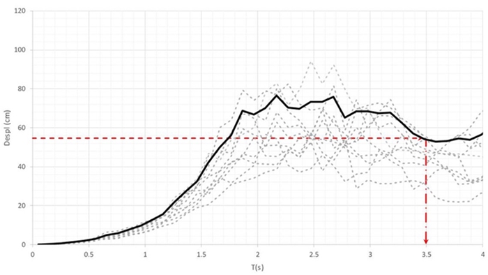 Conforme muestra el paso 3 de la Figura 4, el espectro de diseño de desplazamientos se usa para establecer el valor de diseño para el periodo fundamental de vibrar de las rejillas perimetrales (TT ). Note que esto implica tener un umbral máximo de pseudo-desplazamiento (Sdmax ) para un modelo equivalente de un grado de libertad de las rejillas perimetrales (ver Figura 3). En resumen, una vez que se tiene disponible IDImax , es posible estimar un umbral de desplazamiento de diseño para el nivel de azotea (δD ). El valor de Sdmax resulta de corregir δD considerando que el primero corresponde a un modelo equivalente de un grado de libertad del sistema estructural y el segundo, a la azotea de un modelo tridimensional detallado (de varios grados de libertad) del mismo.