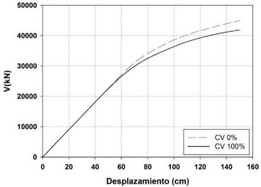 Vale la pena mencionar que la rejilla perimetral siempre tomará una porción de las cargas verticales, independientemente de la configuración utilizada para el sistema gravitacional. En el caso de la superestructura innovadora, la rejilla soporta 17% del total de la carga vertical. La Figura 8 muestra las curvas de capacidad para la rejilla sin y con su carga vertical. Note que la resistencia lateral de la rejilla se reduce alrededor de 7% ante la presencia de su carga vertical. Por eso, es posible decir que el desempeño sísmico esperado para el sistema innovador no se ve afectado de manera importante por la presencia de las cargas gravitacionales.