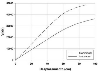 Inicialmente se llevó a cabo un análisis estático no lineal de ambas estructuraciones del edificio. La figura 9 presenta las curvas de capacidad de los sistemas estructurales tradicional e innovador. Es posible apreciar que para una ductilidad de 1.5, el sistema innovador es capaz de acomodar un desplazamiento de azotea de 1m. El sistema tradicional exhibe una rigidez y resistencia laterales que son alrededor del 50% mayores que los valores correspondientes al sistema innovador.