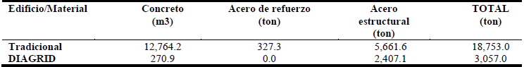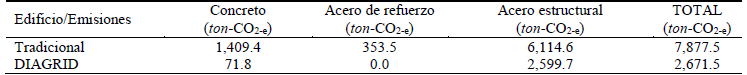 La tabla 1 presenta la cuantificación de concreto, acero de refuerzo y acero estructural empleado en los edificios tradicional e innovador. Considerando los factores de emisión anotados anteriormente, la tabla 2 indica, para ambas estructuraciones, las emisiones correspondientes a cada material. Es importante mencionar que se consideró el mismo factor de emisión para el acero de refuerzo y el acero estructural, y que las emisiones se reportan en términos de CO2. El subíndice e, que es utilizado para identificar las emisiones del concreto indica que se están considerando otros gases de efecto invernadero adicionales al CO2.