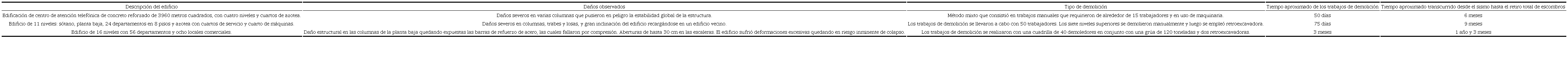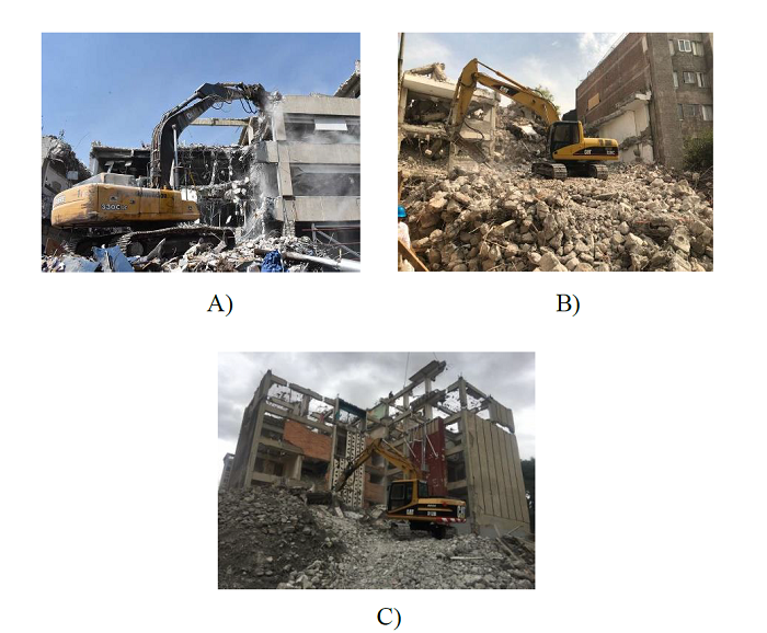 En la tabla 5 se muestra el tiempo aproximado de demolición y el tiempo transcurrido desde la ocurrencia del sismo del 19S de 2017 hasta el retiro total de escombros de tres edificaciones que resultaron con daños severos en la Ciudad de México, las cuales se muestran en la figura 11. La demolición del edificio recargado en un edificio contiguo se retardó varios meses debido a juicios de amparo promovidos por los propietarios del edificio vecino afectado. Asimismo, los trabajos de demolición para un edificio de 16 niveles se llevaron a cabo en aproximadamente tres meses, sin embargo, transcurrió alrededor de un año y tres meses desde el día del sismo hasta el retiro de los materiales de derribo.