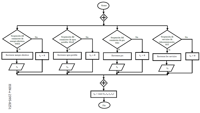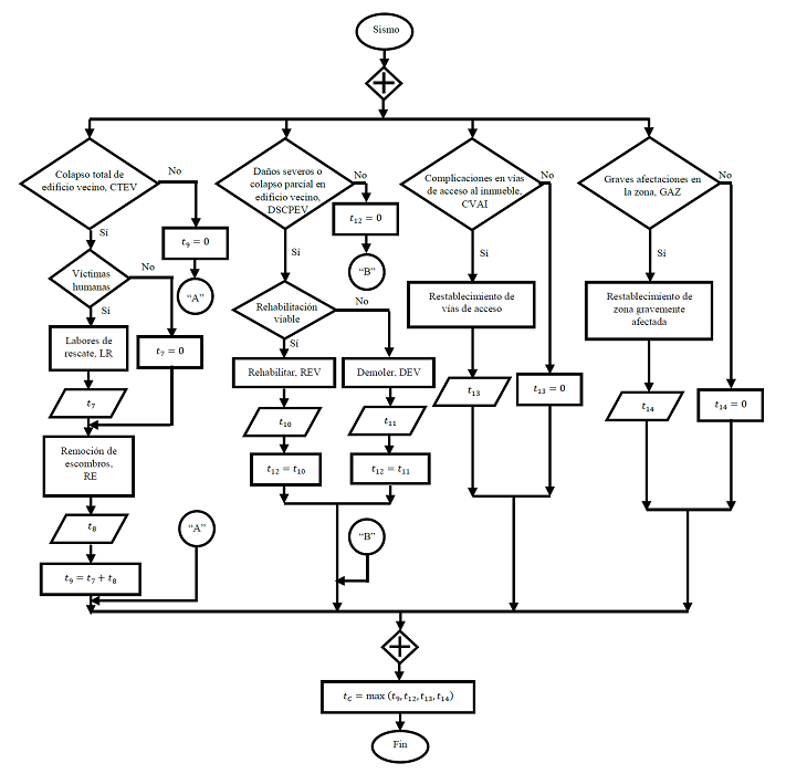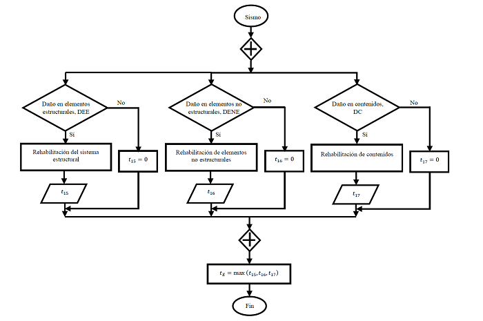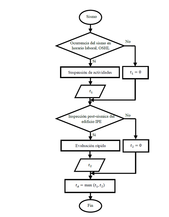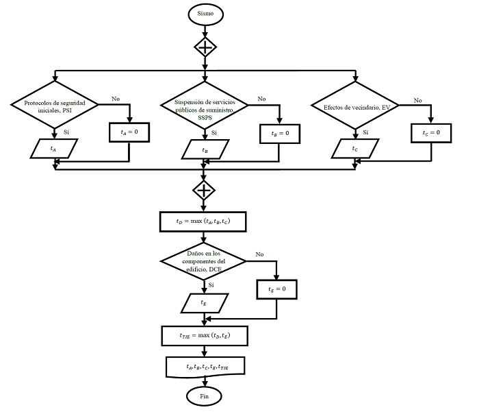 El modelo de tiempo total inactivo de la edificación se muestra en la figura 4 y tiene como inicio la ocurrencia de un sismo. Se verifica en paralelo si se presenta una interrupción de negocio por Protocolos de seguridad iniciales (PSI), Suspensión de servicios públicos de suministro (SSPS) o Efectos de vecindario (EV) tras el sismo. Si la línea de flujo se dirige a la respuesta negativa para cada decisión, entonces , , y , que se definen respectivamente como los tiempos inactivos del edificio resultantes por PSI, SSPS y EV toman un valor de cero, de lo contrario, se leen las variables , y .