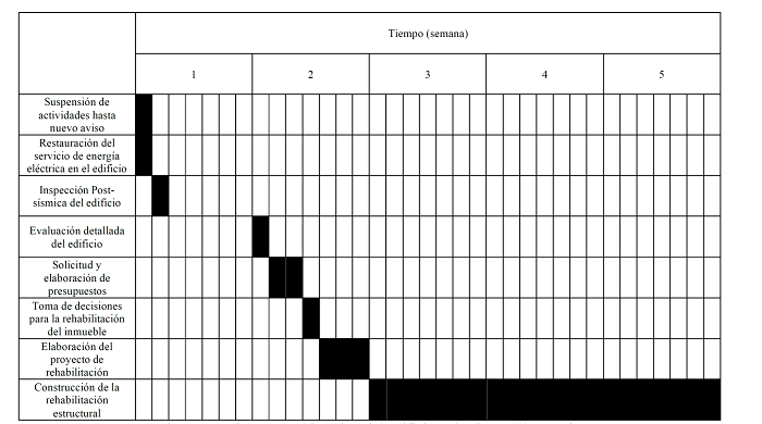 Tras el sismo del 19S del 2017, se observó que los edificios que resultaron con daños en los elementos estructurales o no estructurales quedaron inactivos durante todas las siguientes etapas o en la mayoría de estas: