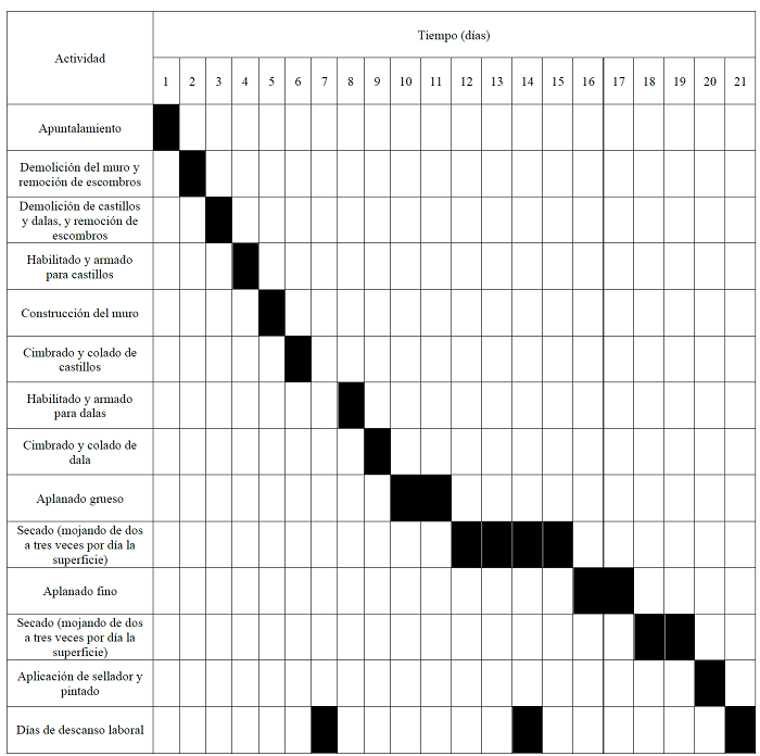En la figura 15 se muestra el diagrama de Gantt con las actividades desarrolladas durante el tiempo de cierre del negocio y en la figura 16 se muestra el diagrama de Gantt del tiempo de ejecución de las actividades de rehabilitación estructural del edificio, el cual se ha determinado con base en rendimientos obtenidos a partir de aplicar entrevistas a expertos en construcción de la CDMX.
