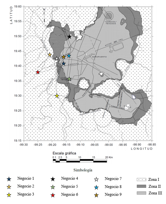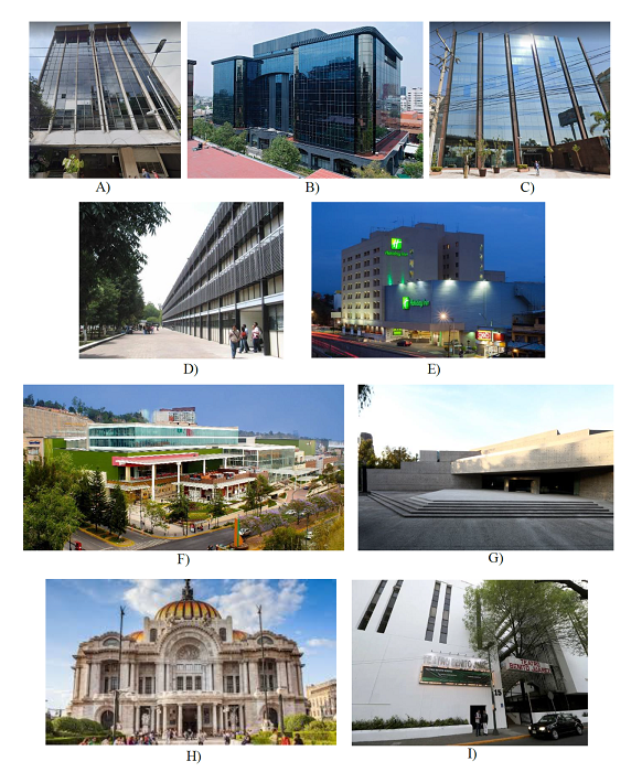 En la figura 2 se muestra la ubicación de los nueve negocios en el mapa de zonificación geotécnica de la Ciudad de México del Reglamento de Construcciones para el Distrito Federal (RCDF, 2017). Puede observarse que el negocio 7 pertenece a la Zona II (Transición), mientras que, por ejemplo, los negocios 1, 6 y 8 se encuentran situados en la Zona III (Lacustre) y los negocios 2 y 3 en la Zona I (Lomas). Por otra parte, en la figura 3 se muestra el edificio en el que se encuentra establecida cada unidad económica. No se dispone de información acerca de que si los edificios han sufrido daños por sismos previos o sobre si han sido rehabilitados. Además, en la mayoría de los casos tampoco se conoce el año en el que fueron construidos. Se tiene un registro de que, por ejemplo, el negocio 7 fue inaugurado el 29 de mayo de 1981, en tanto, el Palacio de Bellas Artes, inmueble que alberga el negocio 8, fue concluido e inaugurado el 29 de noviembre de 1934.