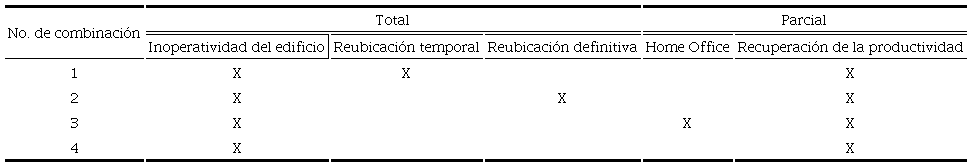 La interrupción temporal de negocio puede ser total cuando hay una paralización absoluta de las actividades por la inoperatividad del edificio en un periodo determinado o mientras se efectúa la reubicación temporal o definitiva del negocio, o parcial cuando pese a desarrollarse las operaciones del negocio, este no se encuentra en condiciones normales, ya sea cuando se opera por medio del Home Office o por la recuperación de la productividad tras la reanudación de las actividades en el edificio. Estas posibilidades pueden combinarse tal como se muestra en la tabla 1; el modelo que se propone en este documento se enfoca en la combinación 4, dejándose para un futuro refinamiento contemplar las opciones de Home Office y las relocalizaciones del negocio.