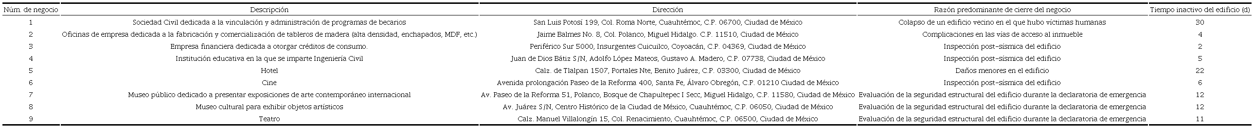 Obsérvese que, de los nueve negocios, el negocio 1 fue el que mayor tiempo presentó una paralización de actividades con 30 días, ya que por medidas de seguridad los directivos tuvieron que esperar 10 días hasta la culminación de labores de rescate de víctimas humanas y 20 días más hasta la finalización de la remoción de escombros tras el colapso del edificio vecino llamado Medellín para poder efectuar la reapertura del negocio, por el contrario, el negocio 3 estuvo cerrado únicamente dos días, ya que en el primer día hubo una suspensión de actividades por el acontecimiento del sismo en horario laboral y al día siguiente se efectuó la inspección post-sísmica del edificio. Por otra parte, el negocio 5 tuvo una interrupción total de 22 días principalmente debido a que el edificio sufrió daños menores y requirió de reparaciones, en tanto, el negocio 8 pudo reabrir tras doce días una vez que se efectuó la evaluación de la seguridad del edificio durante la declaratoria de la emergencia.