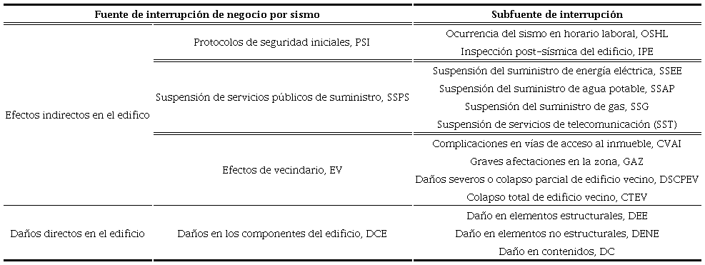 En la tabla 3 se muestran las fuentes de interrupción derivadas del sismo del 19S de 2017 que se contemplan en el modelo de IN (figura 4), clasificadas en cuatro categorías principales: Protocolos de seguridad iniciales (PSI), Suspensión de servicios públicos de suministro (SSPS), Efectos de vecindario (EV) y Daños en los componentes del edificio (DCE), donde las primeras tres se consideran como efectos indirectos en el edificio. Cada una de ellas se divide en varias subfuentes de interrupción que individualmente pueden generar un tiempo de inactividad en el edificio del negocio, sin embargo, el es resultado de la combinación de los distintos tiempos, lo cual se aborda enseguida.
