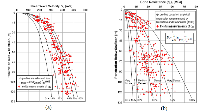 A database of in situ VS measurements with a P-S suspension seismic velocity logger and standard geotechnical engineering material properties for the Bay of Campeche sand has been established. The database allowed the development of several empirical correlations between in situ VS, basic soil properties of sand, and cone net resistance. These equations should be used with caution in predicting the in-situ shear wave velocity in the top 3.5 m because there were no VS measurements in these surficial soils due to the noise transmitted from the vessel to the time records used for VS determination, which made shear wave arrivals difficult to pick. It is recommended the predictions of VS made with the relationships in the top 3.5 m should be limited to the lowest value of 35 m/s.