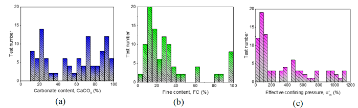 According to the carbonate content shown in Figure 4e, about 70 % of the soil specimens are siliceous sands with carbonate content less than 10 %, and the rest of the specimens are calcareous sands with carbonate content between 10 % and 40 %. The effective confining pressures presented in Figure 4f are between 100 kPa and 700 kPa, with an average of 400 kPa.