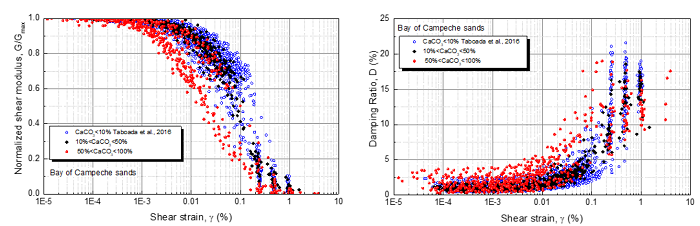 Figure 12 shows the database of the Bay of Campeche and Tabasco Coastline sand of 84 curves of G/Gmax and material damping ratio (D) obtained from resonant column and cyclic DSS tests organized into two groups with carbonate content between 10 % to 50 % and 50 % to 100 % (Flores, et al., 2018). Figure 12 also presents a comparison of G/Gmax and D curves with carbonate content higher than 10 % and curves of silica sands (CaCO3 less than 10 %) of the Bay of Campeche presented by Taboada, et al. (2016). The G/Gmax curves of sands with CaCO3 higher than 10 % show a higher non-linear behavior than the silica sands. That is, G/Gmax of carbonate sands starts to decrease at smaller cyclic shear strains than the silica sands. The damping ratio of carbonate sands is higher than silica sands, especially at cyclic shear strains smaller than 0.1 %. Figure 12 shows that as CaCO3 increases, the G/Gmax curve tends to shift downward and the damping ratio curve tends to shift upward.