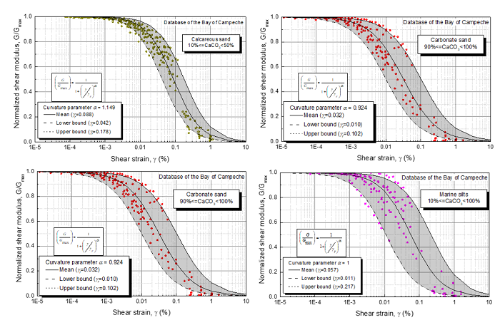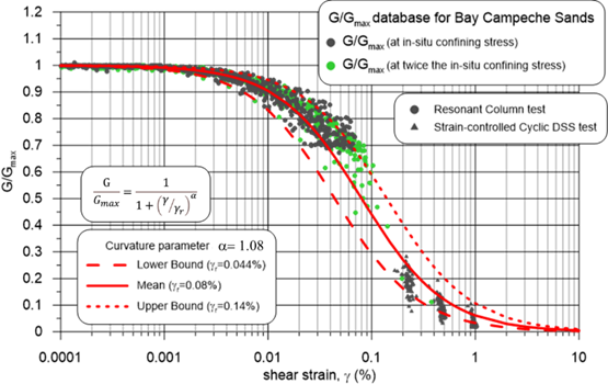 In order to comprehend the non-linear elastic behavior of marine sands and to produce a best-fit functional relationship, a new database has been constructed incorporating G/Gmax-γ and D-γ curves from the Bay of Campeche sand (Taboada, et al., 2016). This curve-fitting process facilitates prediction of shear modulus degradation curves and material damping curves. The relationship between normalized shear modulus (G/Gmax) and shear strain (γ) for the 252 selected tests is plotted in Figure 5.